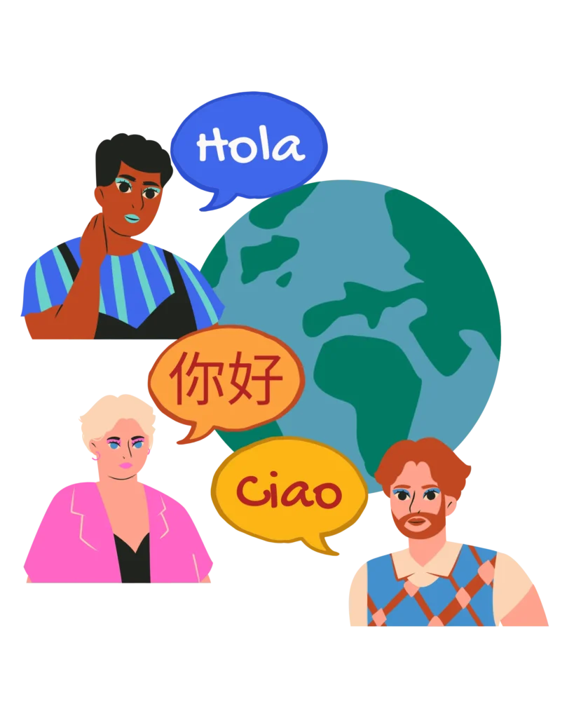 Visuals: Large illustration of people around a globe, each with speech bubbles in different languages.